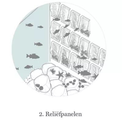 - Driedimensionele reliëfpanelen ter hoogte van de hoeken van het eiland waar visjes en andere kleine organismen een schuil- of woonplaats kunnen vinden;