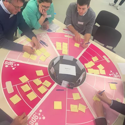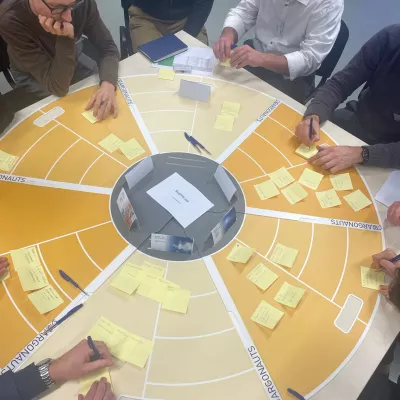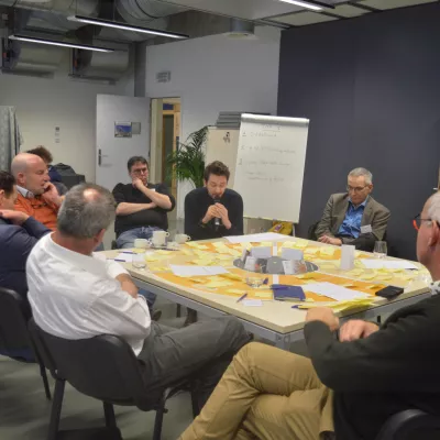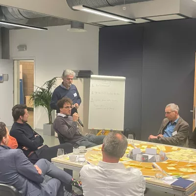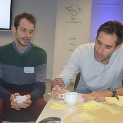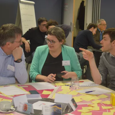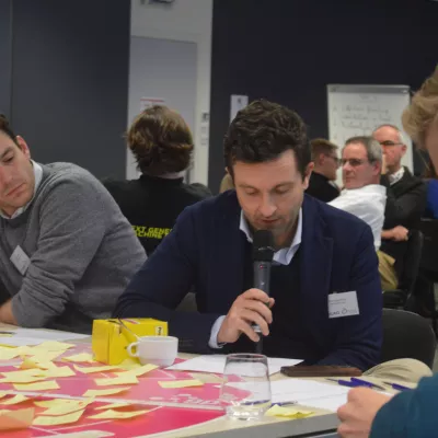 Tijdens de namiddagworkshop was het hard werken. De deelnemers verdeelden zich in kleine groepen en gingen aan de slag rond specifieke uitdagingen. Het groepswerk mondde uit in 12 verschillende projectideeën.
