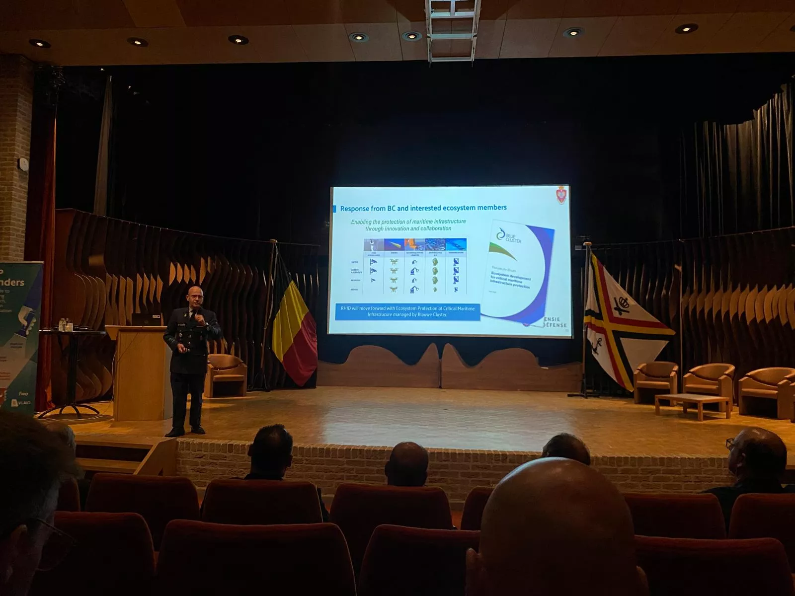 Ook werd de studie toegelicht die De Blauwe Cluster voor Defensie heeft uitgevoerd rond de bescherming van onze kritieke maritieme infrastructuur. Daarbij werd aangekondigd dat De Blauwe Cluster zal instaan voor het ecosysteem dat rond dit thema wordt uitgebouwd.