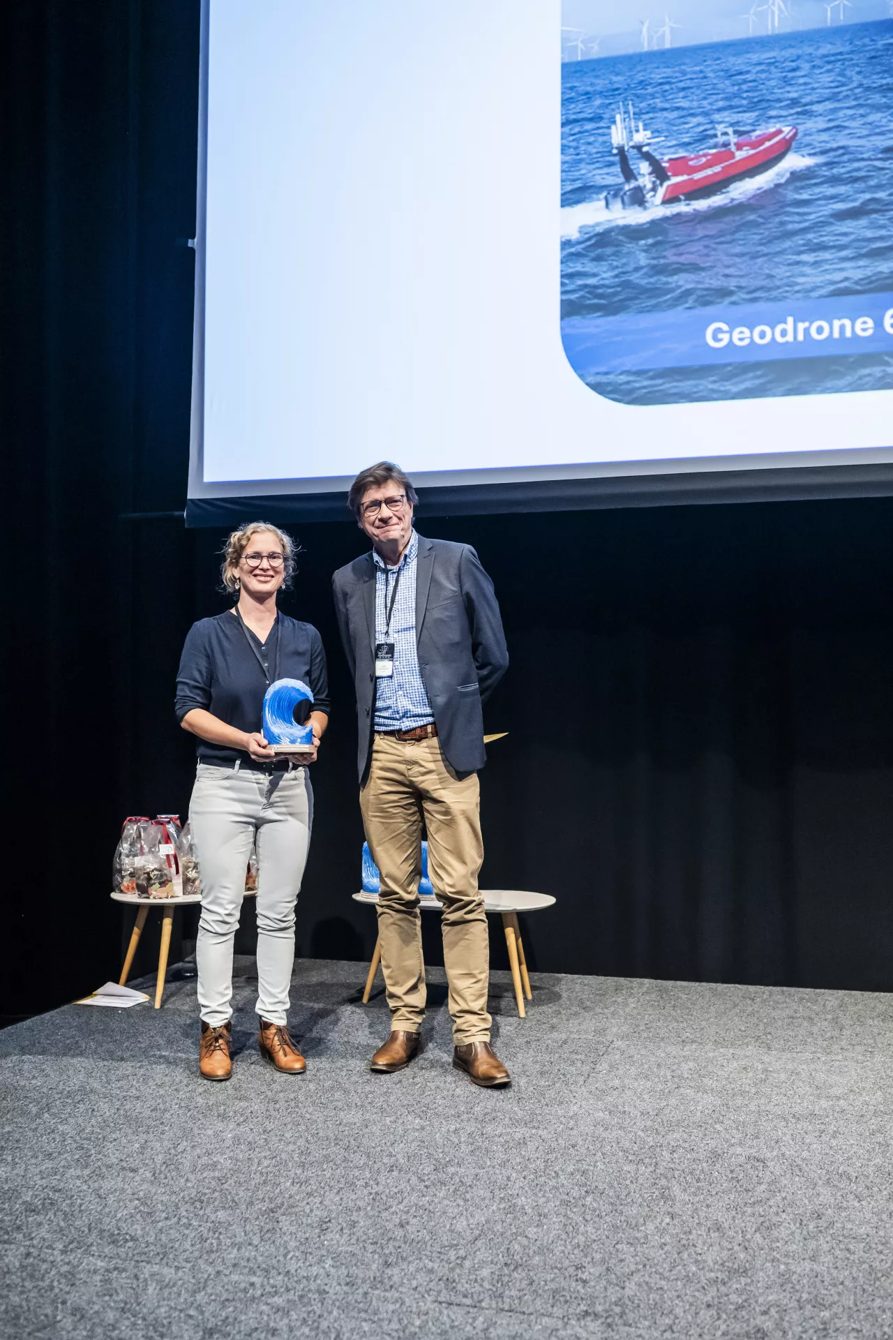 - De Geodrone 6800 van GEOxyz werd beloond met de Corporate Blue Innovation Wave-award. Deze varende drone voert metingen op zee uit zonder bemanning aan boord en wordt volledig op afstand bestuurd vanuit een controlekamer aan land. Dat maakt het werk veiliger, duurzamer en efficiënter, met minder CO2-uitstoot.