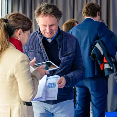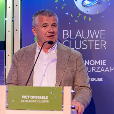 Piet Opstaele, kersvers CEO van De Blauwe Cluster, nam daarbij het woord. Hij stelde zich kort even voor, en lichtte daarbij beknopt de plannen en ambities voor de netwerkorganisatie toe.